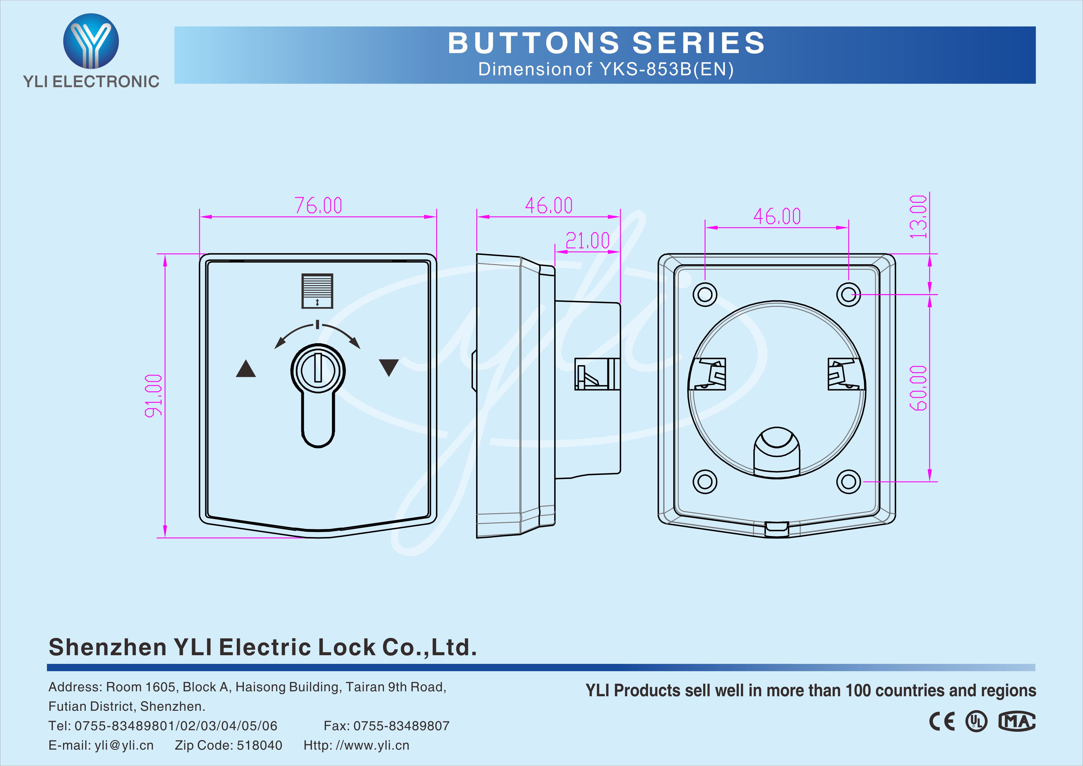 YKS-853A(EN) is anEuropean Standard Waterproof Key Switch for Rolling Door in size of 76Lx91Wx46H(mm). They are often used in public authorities, banks, large、small and medium-sized enterprises, department stores and residences.