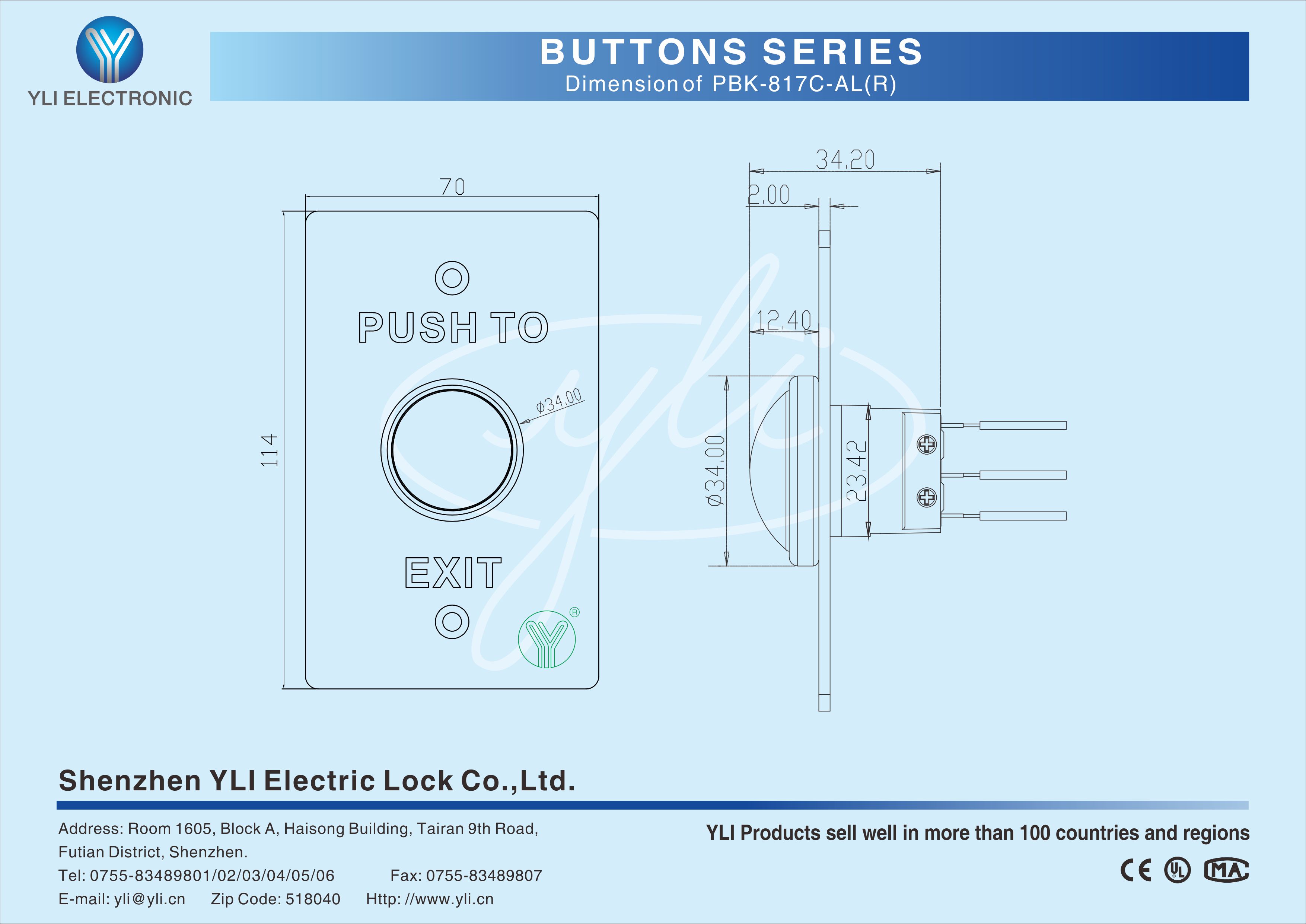 PBK-817C-AL(R) Door Release Button is a big metal button.(Access Control System Exit Button) 304 stainless steel panel with size of L114xW70xH34.2(mm). They are often used in public authorities, banks, large、small and medium-sized enterprises, department stores and residences.