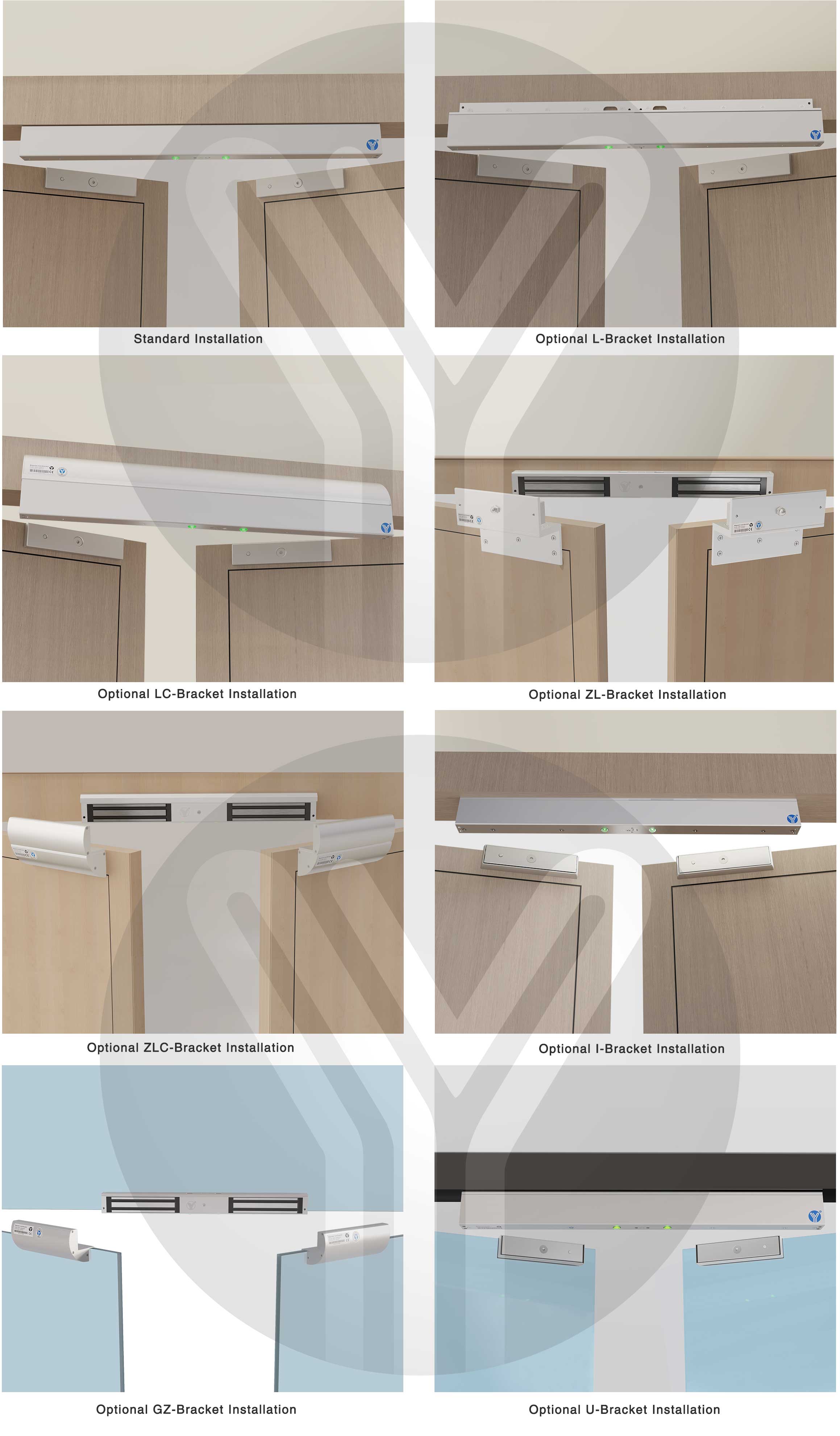 YM-280ND(LED) Double door magnetic lock is designed for wooden door, metal door, glass door and fireproof door. There is a set of lock status signal (NO/NC/COM) output contacts. The lock body is equipped with a large LED light . The green light indicates unlocking , and the red light indicates locking. YLl magnetic lock cores are produced with robotic laser welding technology, providing 2 to 3 times stronger impact resistance and torsional resistance than conventional production processes. The surface is treated with the internationally leading electroplating process and the lock itself has passed the 240-hour salt spray test in the national laboratory, achieving excellent performance of anti-oxidation, anti-rust and anti-corrosion. Our company offers a complete range of brackets for different locks.