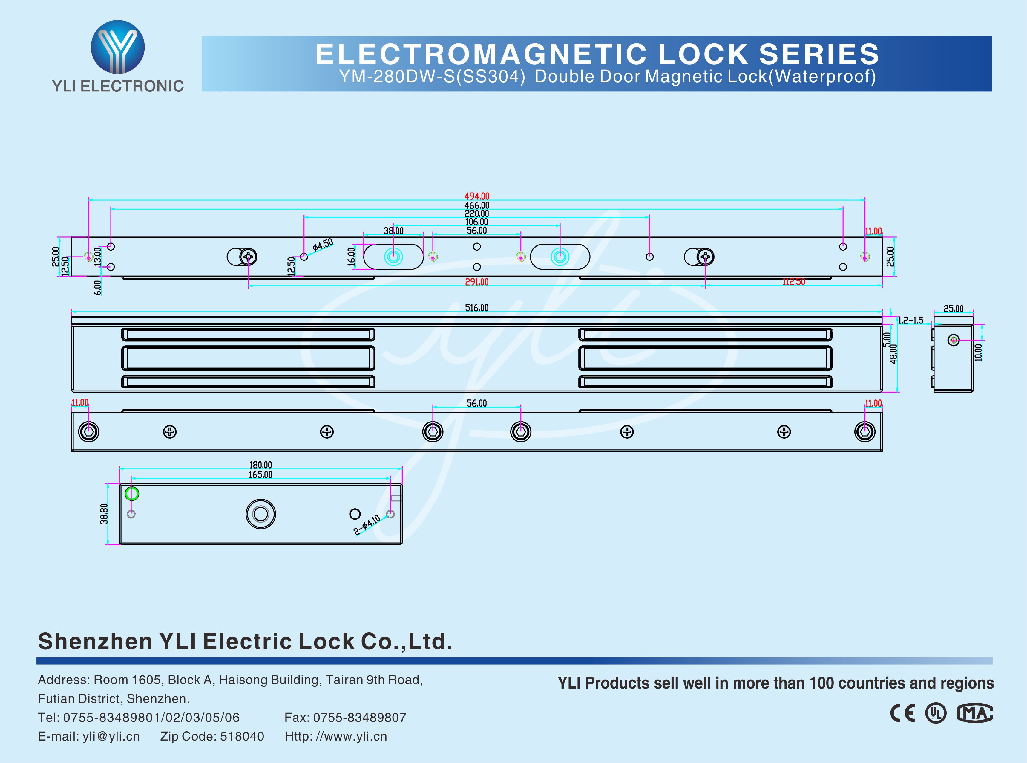 YM-280DW-S(SS304) Double door electric lock with waterproof function, the case is 304 stainless steel materials and it is 100% waterproof treatment.All the accessories are sealed inside the lock cylinder. Specially for metal door, heavy door and so on.