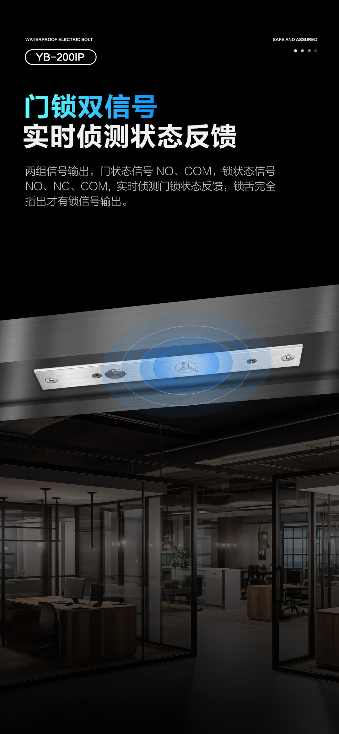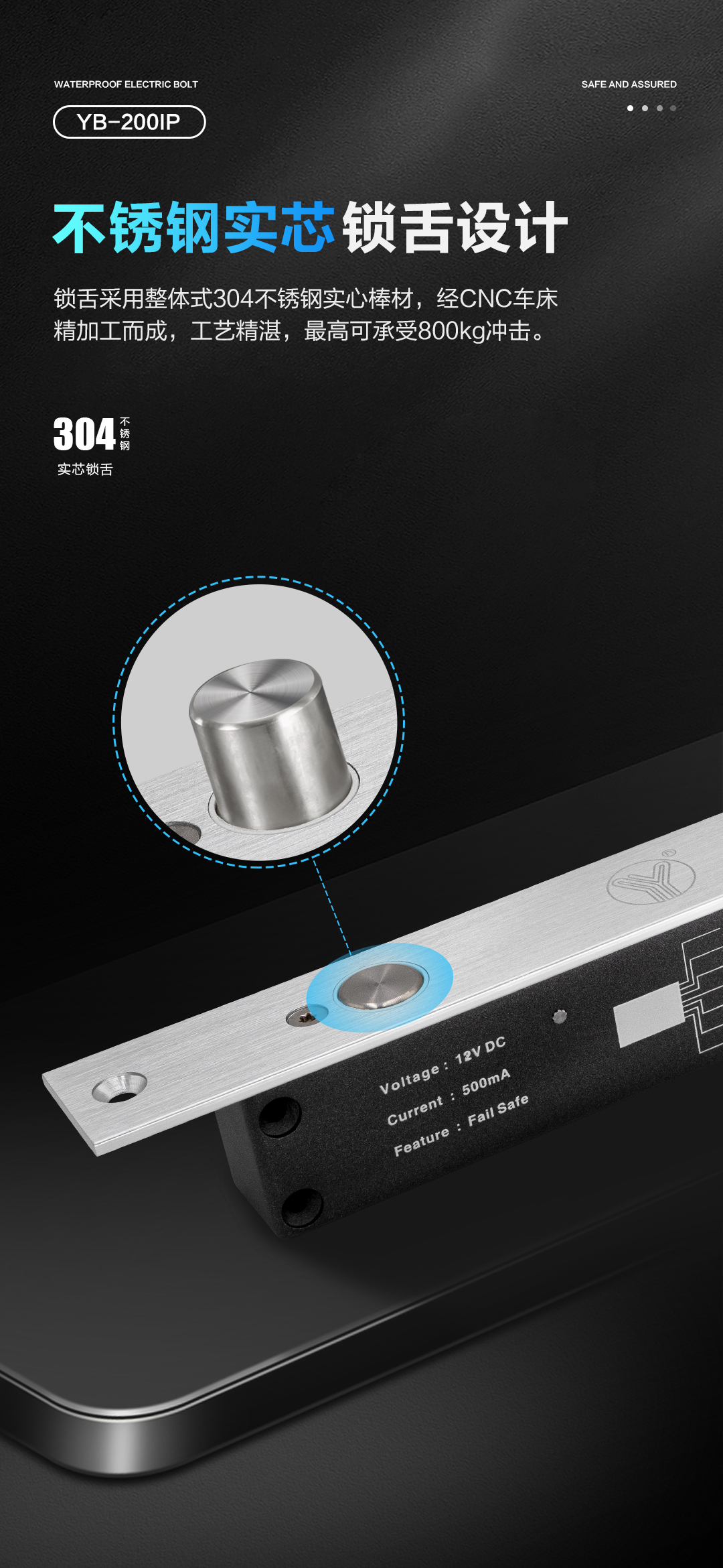 YB-200IP防水電插鎖,經過精心設計和制造,具有優異的防水性能,防水等級達到IP66,即使在潮濕的環境中也能保持穩定和安全。鎖舌采用整體式304不銹鋼實心棒材,經CNC車床精加工而成,工藝精湛,最高可承受800kg沖擊。門/鎖狀態信號輸出,實時偵測門鎖狀態反饋。專業設計的耐用型電磁閥,使用壽命超過50萬次測試合格。
