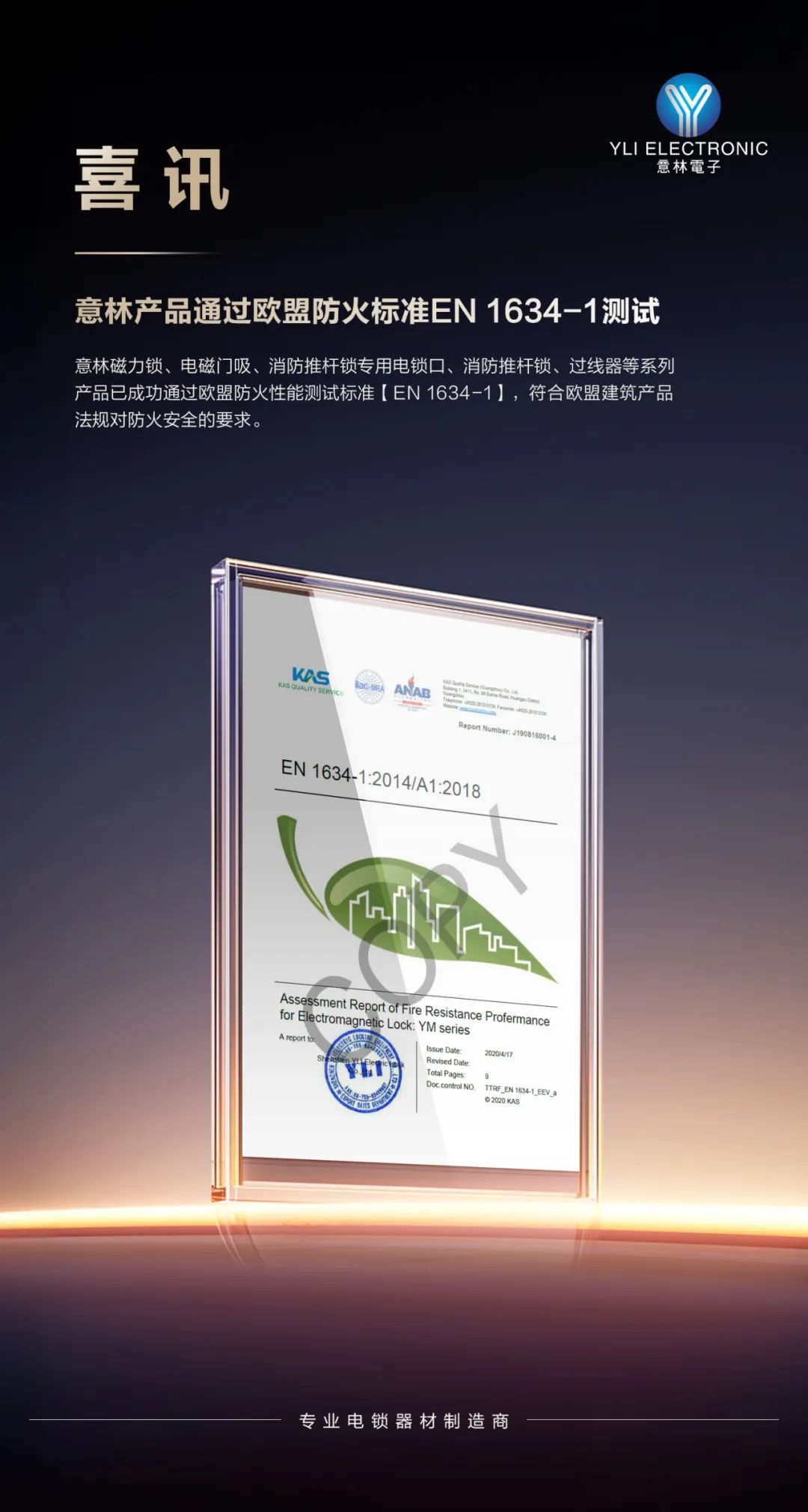 我們很高興地宣布:意林磁力鎖、電磁門吸、消防推桿鎖專用電鎖口、消防推桿鎖、過線器等系列產品已成功通過歐盟防火性能測試標準“EN 1634-1”(耐火測試第1部分:門、卷簾、可開啟窗的防火測試),符合歐盟建筑產品法規對防火安全的要求。