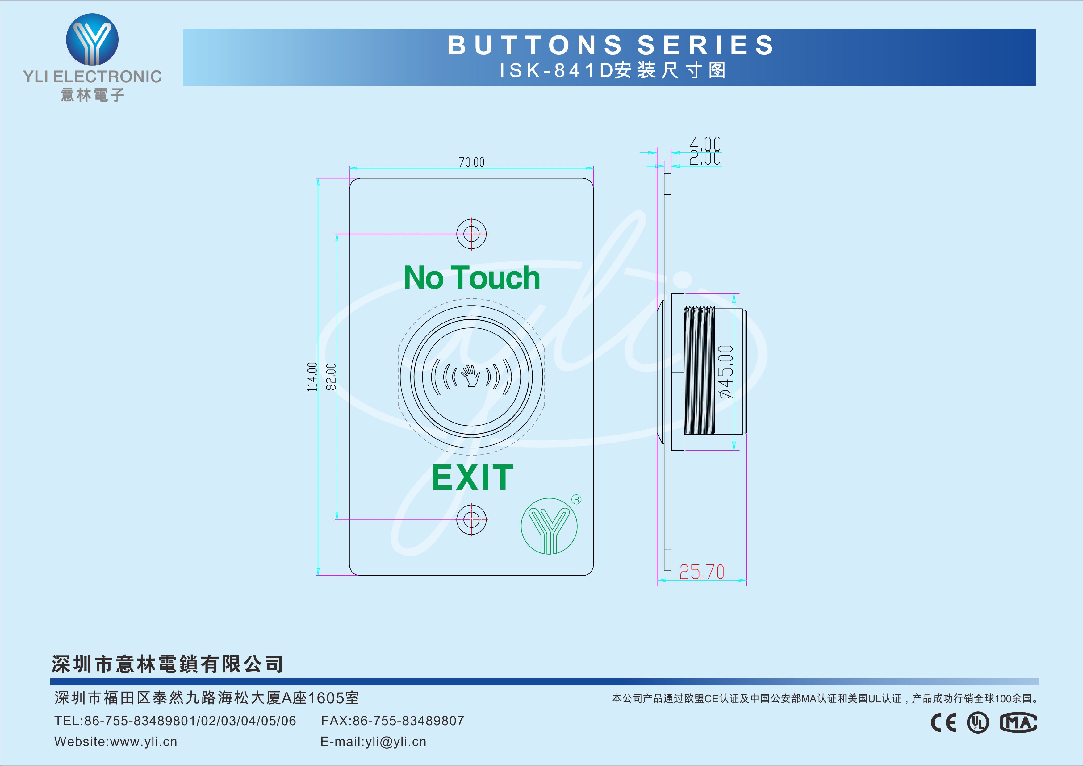 ISK-841D(LED) 是一款紅外感應門禁開關, 具有延時可調功能及紅外感應功能,感應距離4-12cm可調。LED燈顯示: 紅色待機狀態; 綠色動作狀態。采用304不銹鋼拉絲工藝處理,耐磨抗沖擊,堅固耐用。適用于智能樓宇、住宅小區、辦公樓、酒店、醫院、體育館等場所使用。